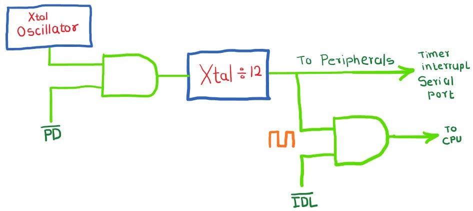 As shown in the above figure of 8051 power control logic, two control bits are there, IDL and PD, which are used for Idle and Power-down mode respectively.